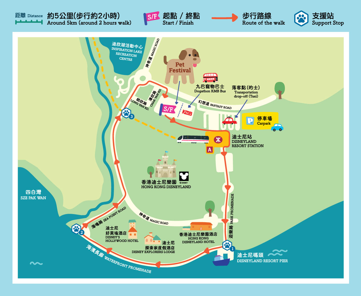 你可選擇獨自帶同愛犬或組隊結伴參加「全城狗狗行善日」,暢遊香港迪士尼樂園度假區全長5公里的景觀步道。